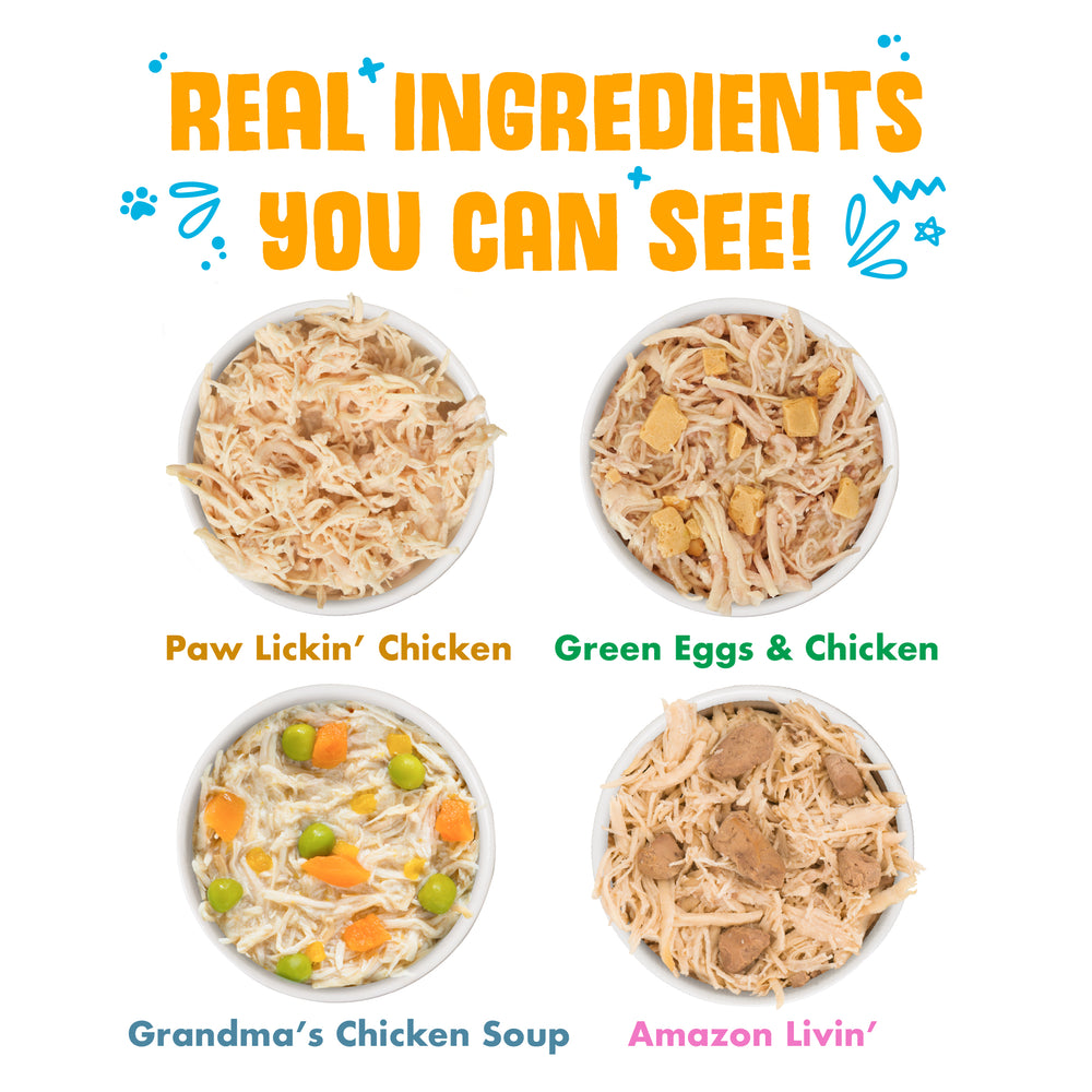 Paw Lickin' Chicken: Chicken (Boneless, Skinless Breast), Chicken Broth, Potato Starch, Sunflower Seed Oil, Calcium Lactate, Xanthan Gum, Tricalcium Phosphate, Choline Chloride, Taurine, Zinc Sulfate, Vitamin E Supplement, Ferrous Sulfate, Nicotinic Acid (Vitamin B3), Thiamine Mononitrate (Vitamin B1), Calcium Pantothenate, Copper Sulfate, Riboflavin Supplement (Vitamin B2), Pyridoxine Hydrochloride (Vitamin B6), Vitamin A Supplement, Manganese Sulfate, Vitamin D3 Supplement, Folic Acid, Potassium Iodide, Sodium Selenite, Biotin, Vitamin B12 Supplement.