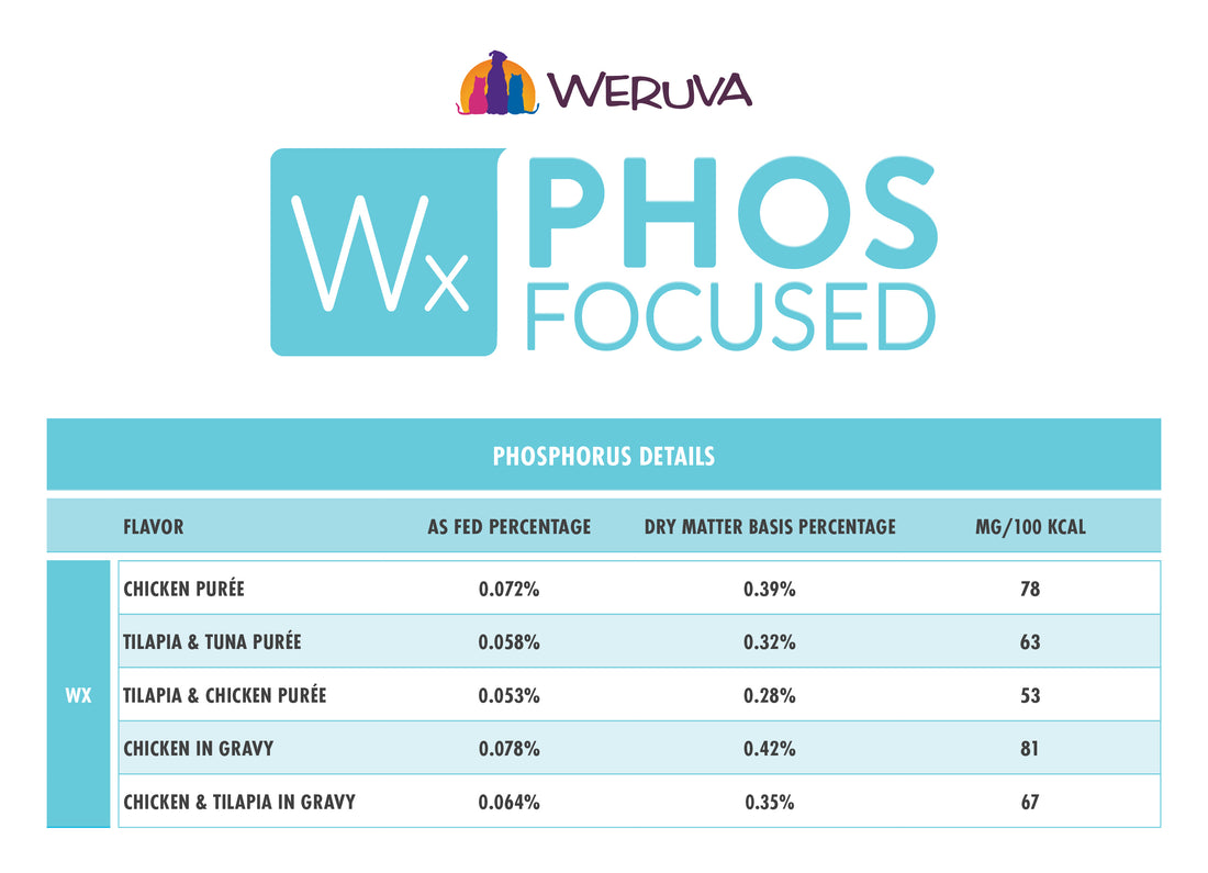 With Wx Phos Focused foods, we have designed formulas with such low phosphorus levels that they are not complete and balanced (per AAFCO standards). And this includes formulas that are more than 20% less than AAFCO minimum standards for phosphorus. We have accomplished this without sacrificing the integrity or quality of ingredients or processing.
