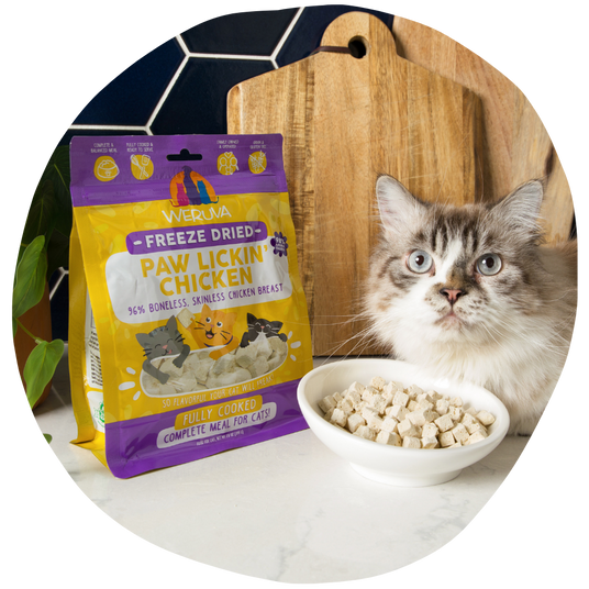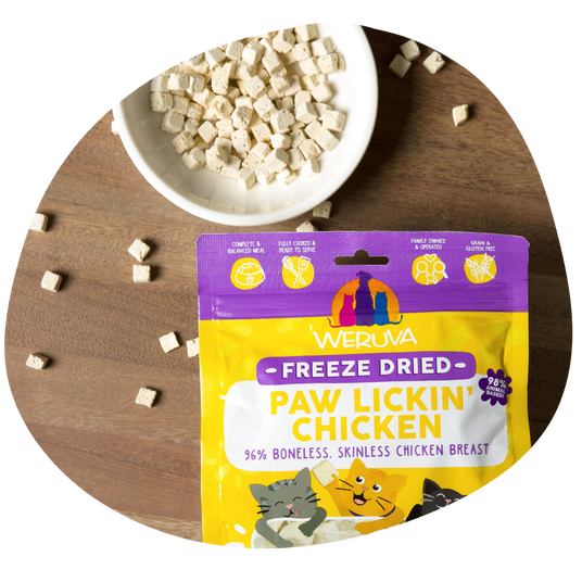 Combining Weruva Cat Freeze Dried with your cat's favorite wet foods can enhance your cat's diet by offering a balance of hydration and high-quality protein. Wet food provides your obligate carnivore with essential hydration, while our freeze dried food gives your cat a protein-packed option that also adds a satisfying crunch. By pairing both in your cat’s bowl, you're offering a varied texture experience and ensuring they get a range of nutrients that support their overall health.