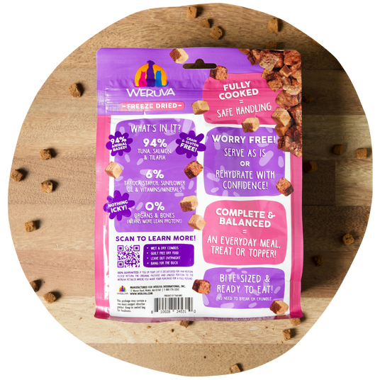 Fully cooked and ready to serve, Weruva Cat Freeze Dried foods are safe to leave out overnight without worrying about spoilage. This is ideal for cats who prefer to graze or eat at their own pace. Unlike raw food, which can spoil and carry risks, our freeze drying process ensures our foods remain stable at room temperature. They contain no raw or wet ingredients, so there’s no concern about bacterial growth. Our process preserves the food's natural nutrients and flavors, ensuring your cat enjoys fresh, safe food whenever they choose to eat. It’s simple, worry-free feeding that works with your cat’s habits.