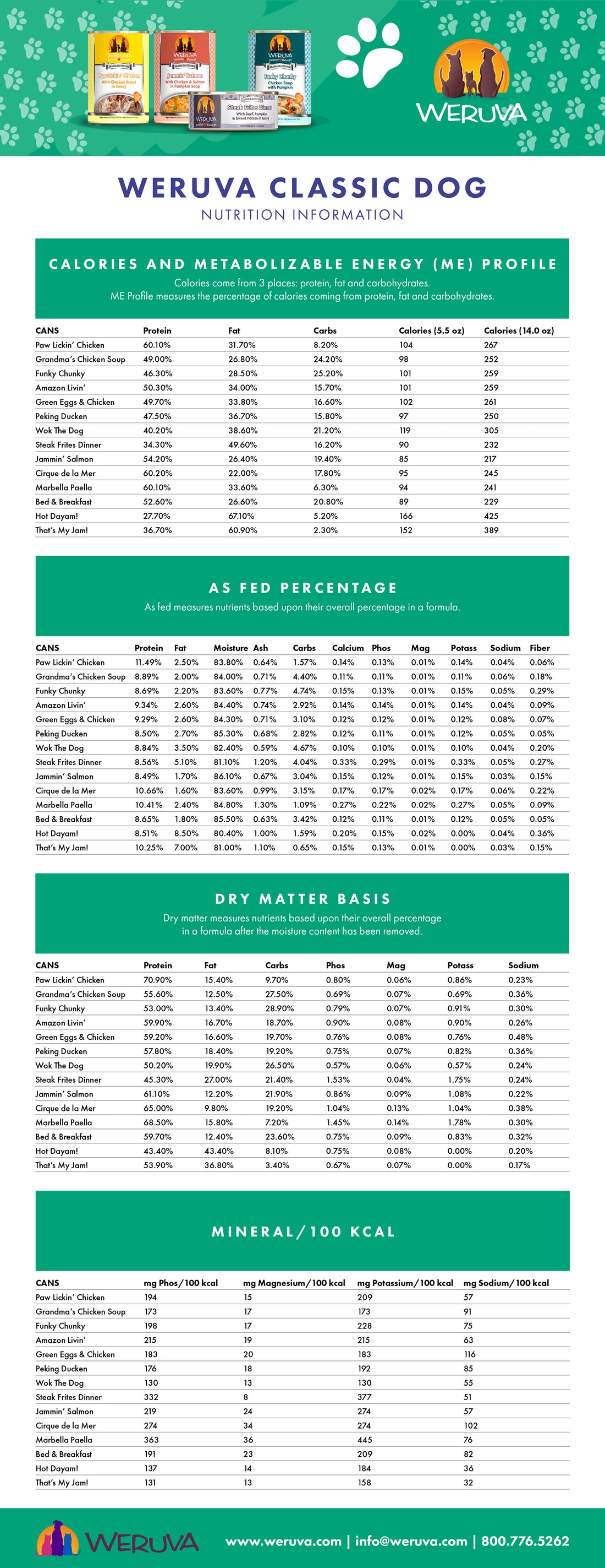 Despite how much your canine friends ask for Weruva's high-quality foods, it's best to transition them gradually onto a new food over a week. Start by mixing a small amount of Weruva in with their old food and slowly increase the amount of Weruva fed over 7 days. This will help your dog adjust to their new Weruva foods.