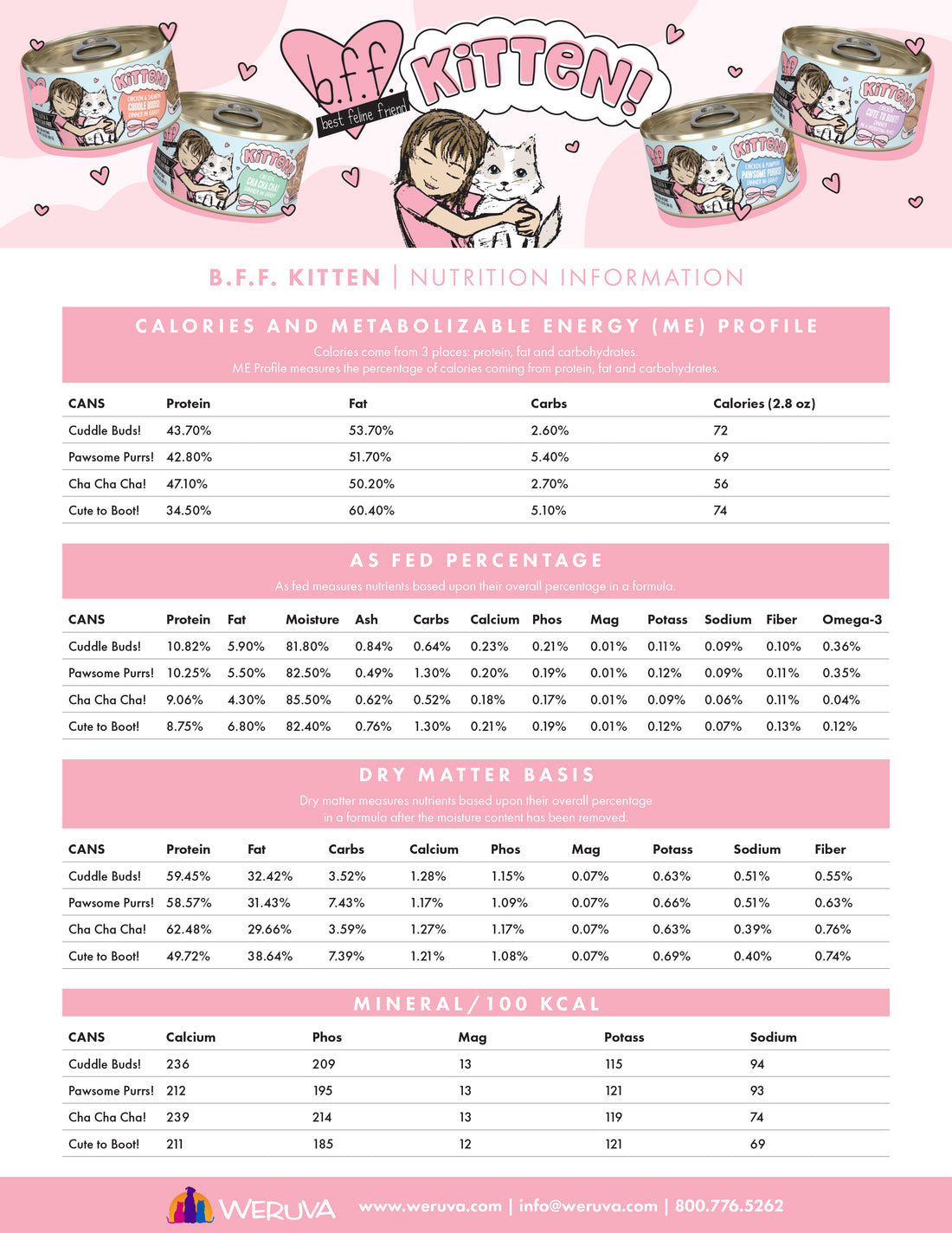 Despite how much your feline friends ask for Weruva's high-quality foods, it's best to transition them gradually onto a new food over a week. Start by mixing a small amount of Weruva in with their old food and slowly increase the amount of Weruva fed over 7 days. This will help your kitty to adjust to their new Weruva foods – Because WeLuvya